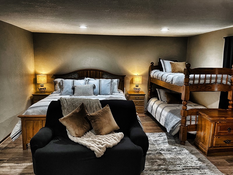 - The lower level provides a King sized bed and a set of bunk beds along with a full laundry room.